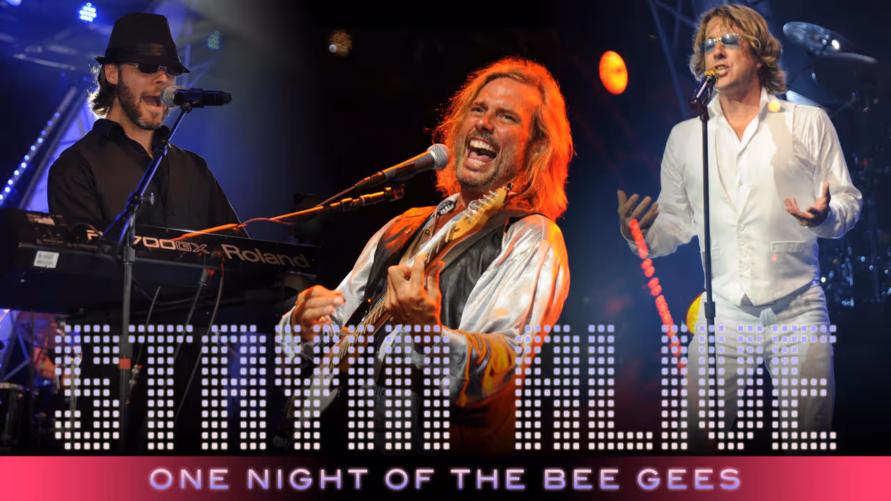 STAYIN’ ALIVE is the largest and most definitive production of its kind, offering big screen video clips, photos and dazzling imagery. STAYIN’ ALIVE has played intimate settings as a six piece band and huge venues with a 62 piece orchestra. STAYIN’ ALIVE is the quintessential tribute band to the Bee Gees, capturing the excitement of live performance and the tender subtleties of the human voice!
